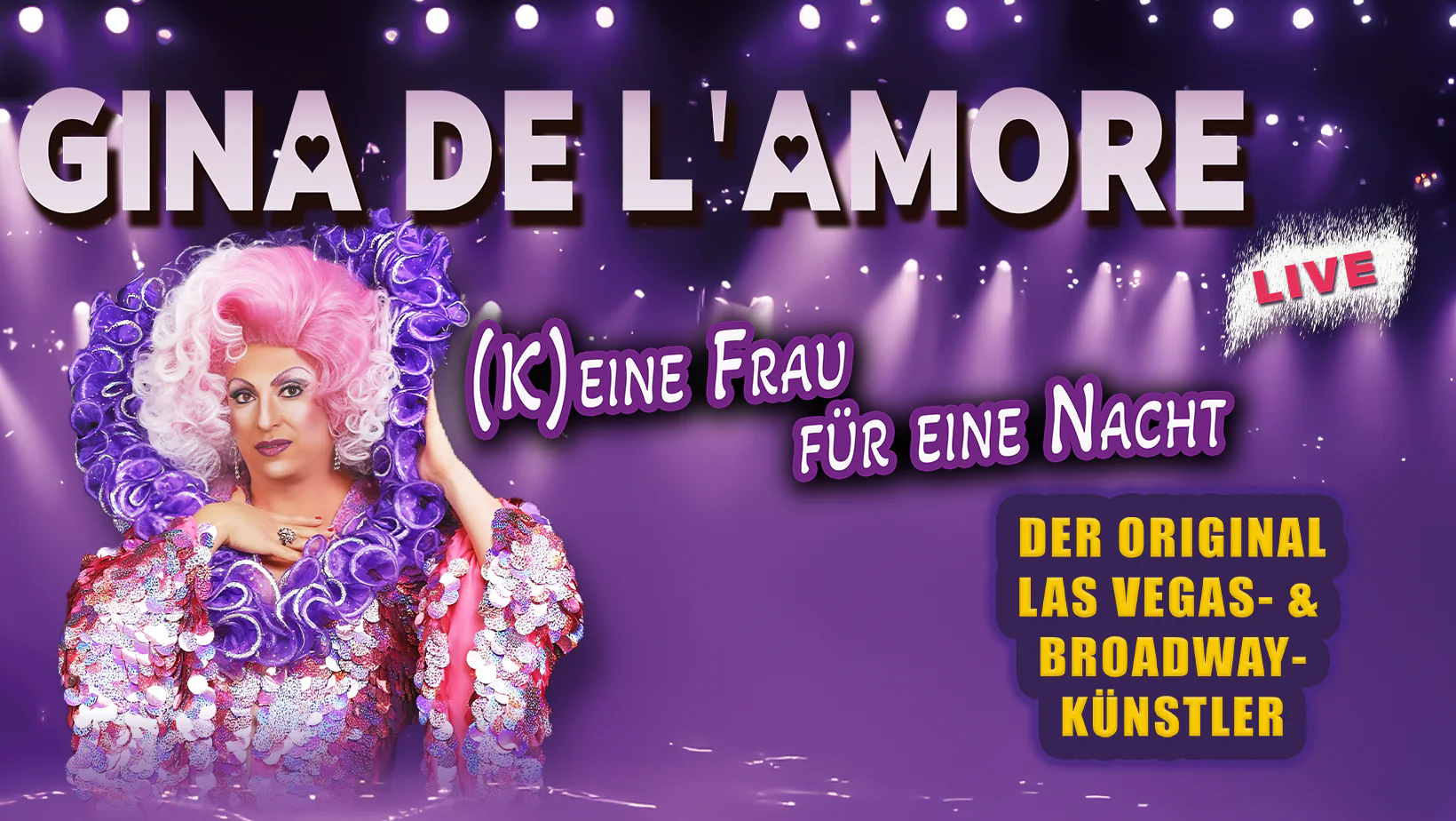 Die „First Lady der Travestie“ ist seit mehr als 20 Jahren auf internationalen Bühnen und in diversen TV-Sendungen unterwegs. Mit ihrer mitreißenden Solo-Show verzauberte Gina im Dezember 2024 sowohl die schillernden Bühnen von Las Vegas als auch den legendären Broadway in New York. Auf den größten TUI-Cruises „Mein Schiff“ und „AIDA-Kreuzfahrtschiffen“ und dem Pulverfass in Hamburg unterhält sie die voluminösen Theatersäle mit gefühlvollem phantastischem Live-Gesang.